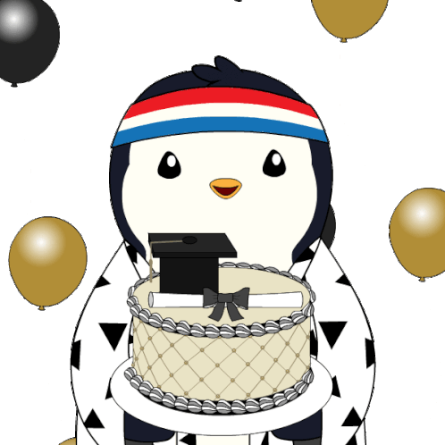 A cute Pudgy Penguin celebrates graduation, holding a cake topped with a cap and diploma, surrounded by balloons.
