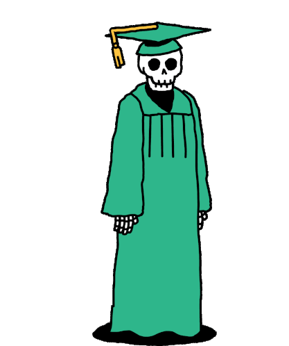 A humorous animated skeleton celebrates graduation, wearing a green cap and gown, perfect for congratulating new grads.