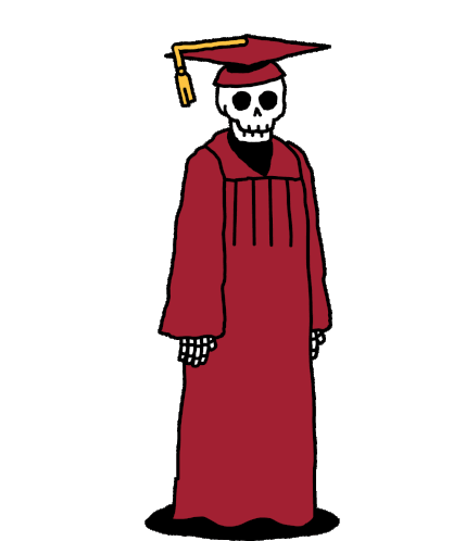A cartoon skeleton celebrates graduation, wearing a red cap and gown with subtle arm movements.