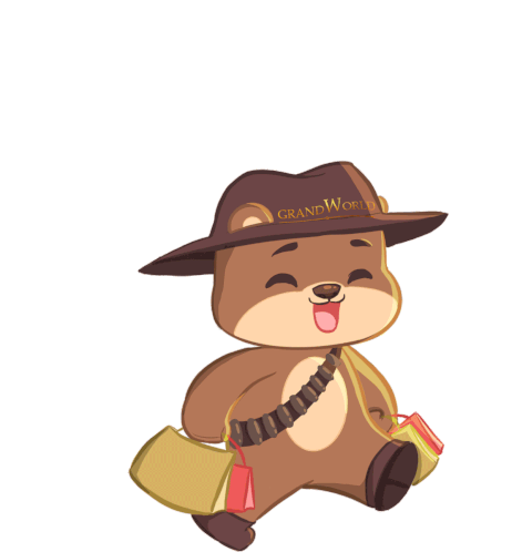 A cheerful Grand World Phú Quốc teddy bear, wearing a hat and bandolier, happily skips with two shopping bags.