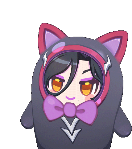 Grandchase character Nelia in a chibi cat-ear costume, looking suspicious with a mischievous expression.
