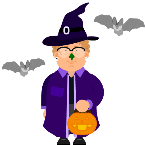 Oma Doris, a granny dressed as a witch for Halloween, holds a pumpkin with bats flying around.