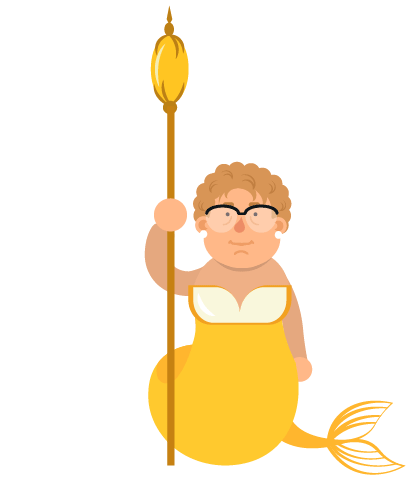 A cartoon grandmother mermaid with glasses and curly hair holds a golden trident, swimming underwater with bubbles.