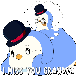 a penguin wearing a top hat and glasses is sitting on another penguin 's back and says i miss you grandpa