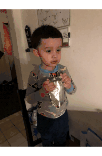A young boy sits playfully on a man's shoulders, holding onto his head, while they relax on a couch.