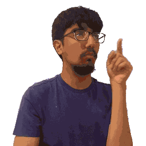 a man wearing glasses and a blue shirt is pointing upwards