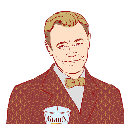 An illustrated man in a suit and bow tie raises a glass of Grant's whiskey, making a 'Triple Good' toast.