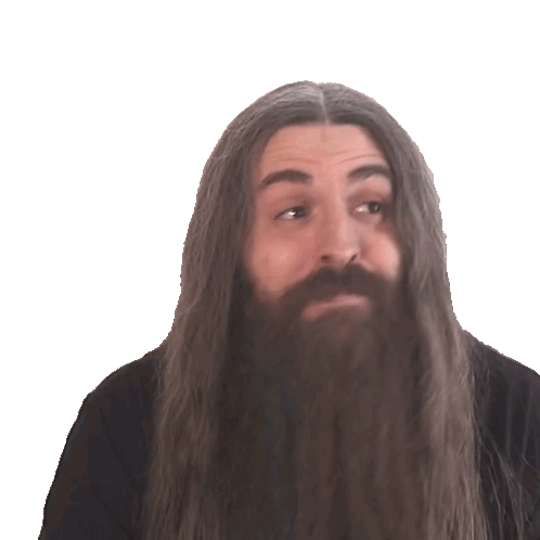 Samus Paulicelli, with his long hair and beard, looks up with a thoughtful expression as the word 'GREAT' appears.