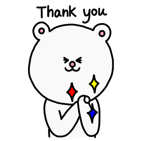 A cute white cartoon bear claps its hands, expressing gratitude with 'Thank you' text and sparkling effects.