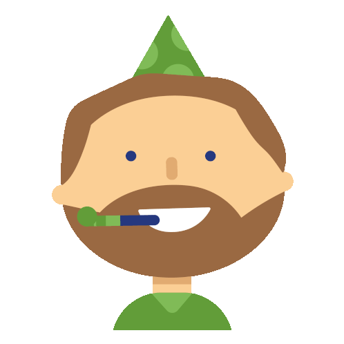 Avatar Robi from Green Agency celebrates with a party blower, wearing a green hat and shirt, expressing joy and festivity.
