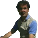 Greg Thompson, wearing a blue shirt and tan vest, waves hello with a friendly smile.