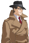 Gregory Edgeworth, a pixel art character, wearing a trench coat and fedora hat, looking serious.
