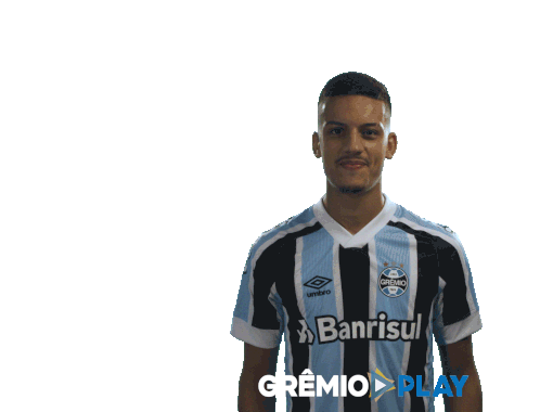 Ricardinho, the Gremio player, smiles and salutes in his Banrisul jersey, celebrating with team spirit.