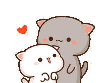Adorable grey and white cartoon cats share a loving moment with a red heart, perfect for expressing affection.