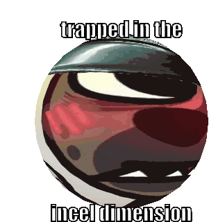 Animated sticker featuring Greyh Haida, a spherical character, with text 'trapped in the incel dimension' and color changes.