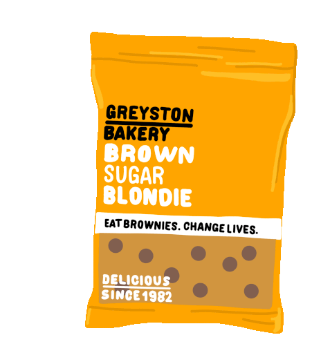 Animated sticker of a Greyston Bakery Brown Sugar Blondie package, featuring the slogan 'Eat Brownies. Change Lives.'