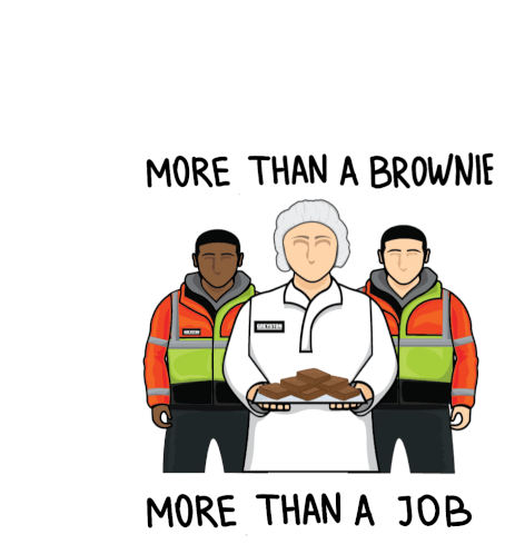 Greyston Bakery's mission: a woman holds brownies, flanked by two men, with the message 'More Than a Brownie, More Than a Job'.