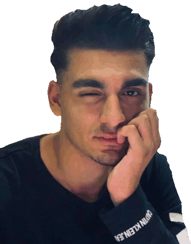 A handsome Greek man winks playfully, resting his chin on his hand, wearing a black Calvin Klein shirt.