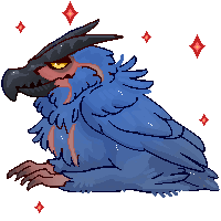 Griffon from Devil May Cry, animated in pixel art, a blue and red bird surrounded by glowing diamonds.