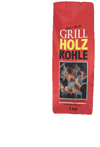 A vibrant red bag of "Grill Holz Kohle" (Grill Wood Charcoal) with an image of burning coals, perfect for BBQ.