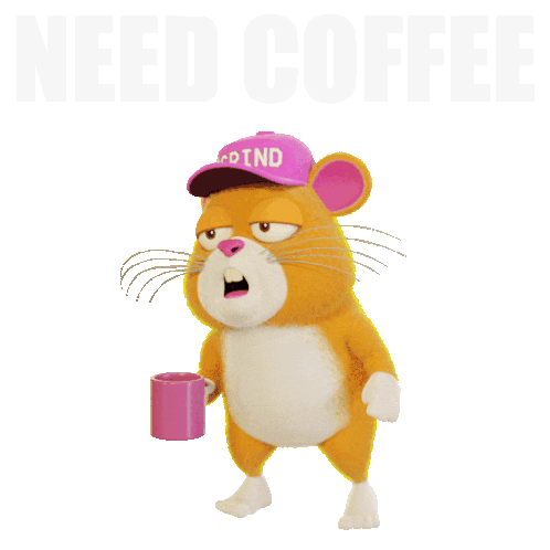 A sleepy, orange hamster wearing a 'GRIND' cap yawns, holding a coffee mug, clearly stating its need for coffee.