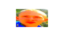 A pixelated, orange-tinted close-up of a child's face with a blue shirt, featuring a distorted 'big head' effect.