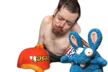 Ricky Berwick spits and pukes liquid next to a blue bunny and a Reese's Puffs container, showing a gross reaction.