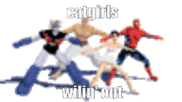 Pixelated characters, including a robot, man, woman, and Spider-Man, dance with 'catgirls wilin' out' text.