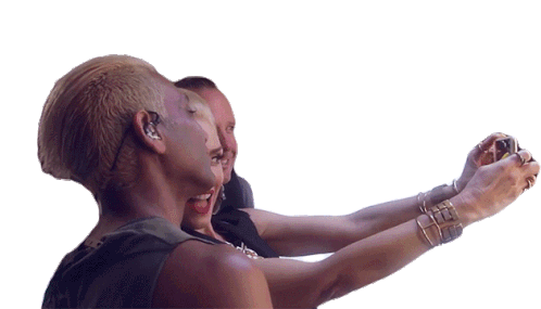 Gwen Stefani, Tom Dumont, and Tony Kanal from No Doubt capture a fun group selfie, smiling and holding a phone.