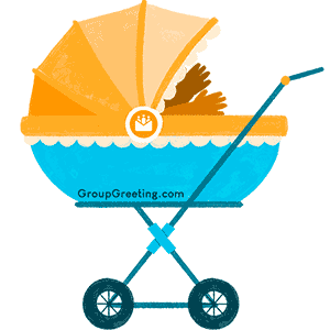 An animated blue and orange stroller featuring the Groupgreeting.com logo, perfect for baby-related messages.