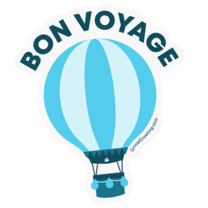 A charming blue and white hot air balloon sticker with the phrase 'Bon Voyage' arched above, perfect for farewells.