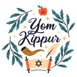 A festive Yom Kippur greeting sticker featuring the holiday name, a shofar, apple, quill, and scroll with the Star of David.