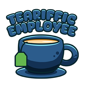 A charming animated sticker featuring a blue teacup with a tea bag, celebrating a 'Teariffic Employee' with a playful pun.