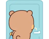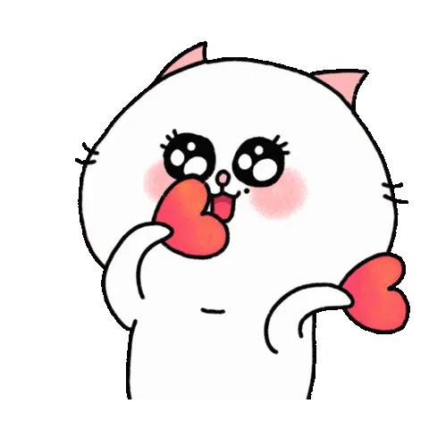 A cheerful white cat-like character with pink cheeks smiles broadly, holding two pulsating pink hearts, symbolizing growing love and friendship.