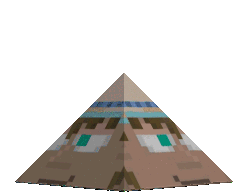 A pixelated character face from Growtopia, featuring a blue eye and hat, rotating within an Okashi Pyramid. A unique game sticker.