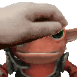 The iconic Grox from Spore, wearing a gaming headset, receives a gentle pet from an unseen hand.