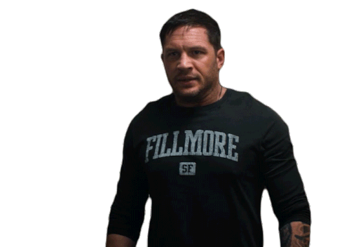 Tom Hardy as Eddie Brock expresses intense anger and frustration with a grr face, clenching his teeth.