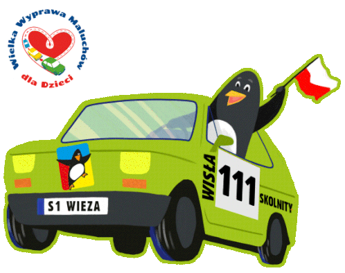 A cheerful penguin drives a green Polish Maluch car, waving a flag for the Great Expedition of Maluchs for Children.