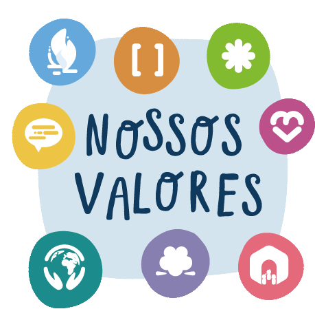 Grupo Marista's 'Our Values' sticker, featuring the Portuguese text 'Nossos Valores' surrounded by eight colorful icons representing core principles.