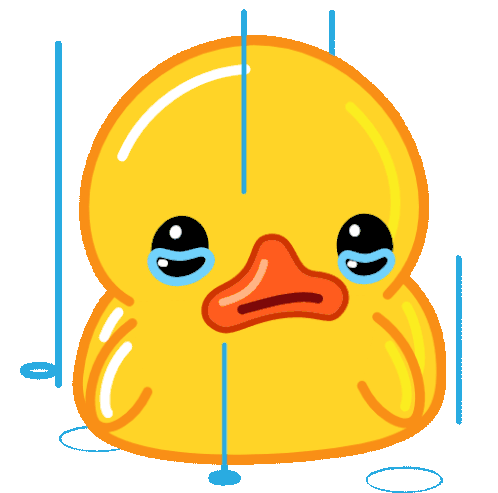 A cute yellow rubber duck is crying, with tears streaming down its face and forming puddles around it.