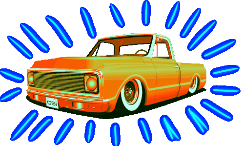 Custom orange GSI Gsimfab Chevy C10 lowrider pickup truck with white wall tires, radiating red lines.