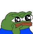 Animated sticker of Gstarludi Peepo, a green frog with big eyes, thinking with a hand on his chin.