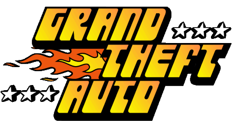 The iconic Grand Theft Auto (GTA) logo, featuring stylized text, flames, and stars, rotates dynamically in 3D space.