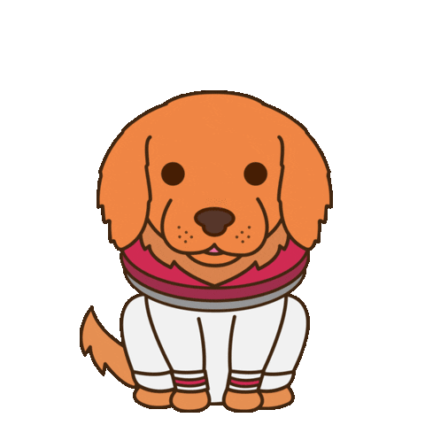 An adorable animated golden retriever puppy sits patiently, wearing a stylish white and red collar.