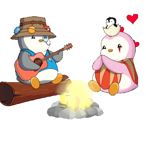 Pudgy Penguins gather around a warm campfire, with one playing a guitar and singing a song while another listens with a baby penguin.