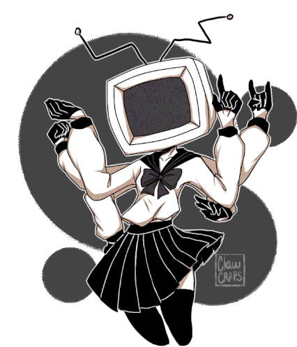 An animated sticker featuring Gumi Echo, a character with a TV head, wearing a sailor uniform, displaying glitch effects and a question mark.