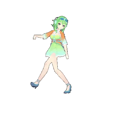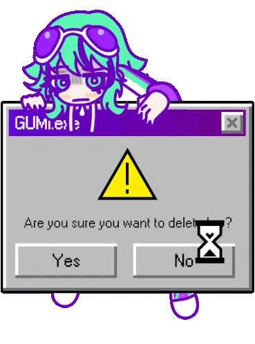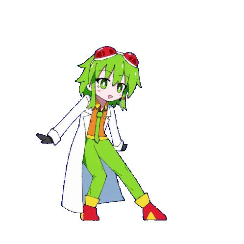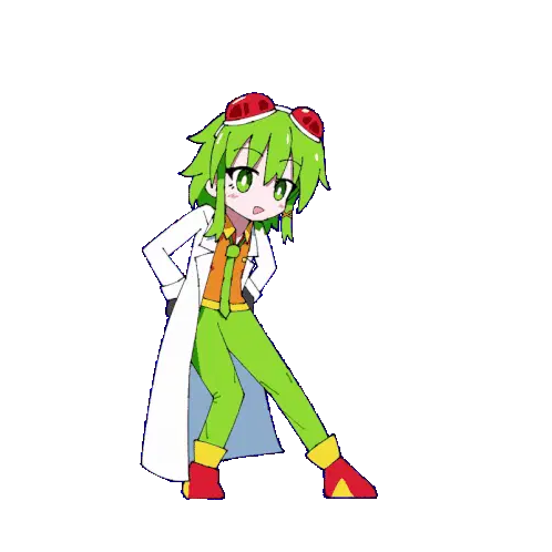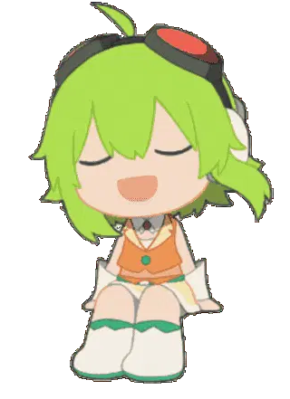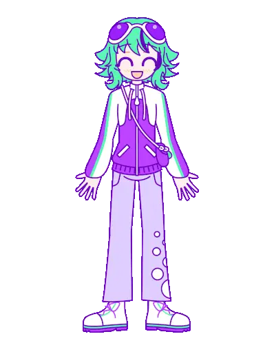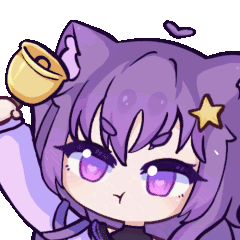 Gumi Gumiixi, a cute anime girl with purple hair and cat ears, rings a golden bell with a determined expression.