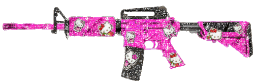 A vibrant pink assault rifle adorned with Hello Kitty branding, shimmering with black glitter and sparkling effects.