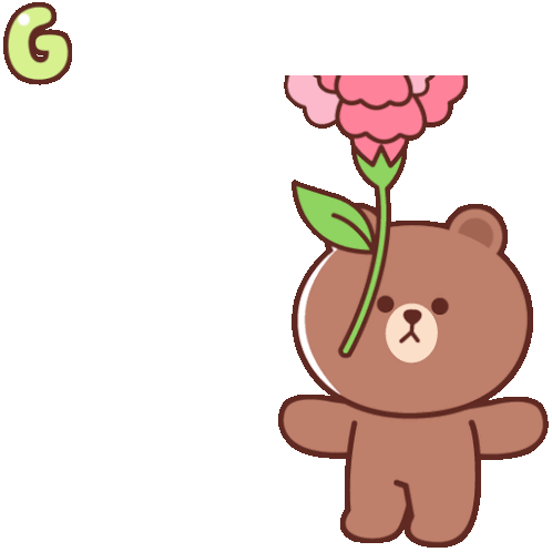 A cute brown bear holds a pink carnation, wishing 'Good Morning' and 'Happy Mother's Day' with floating hearts.