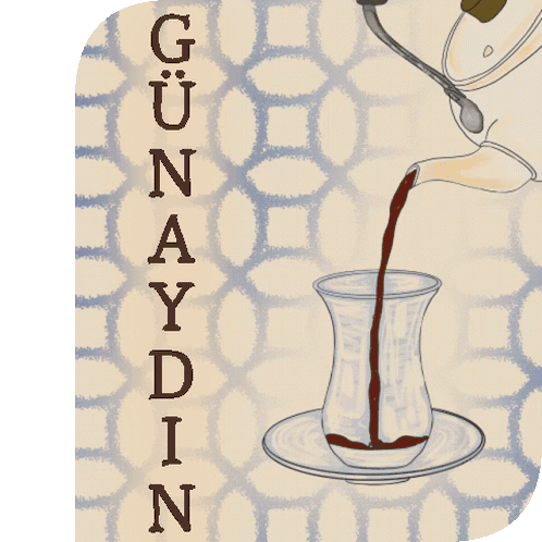 A vibrant animated sticker featuring 'Günaydın' (Good Morning) and a teapot pouring tea into a traditional Turkish glass.